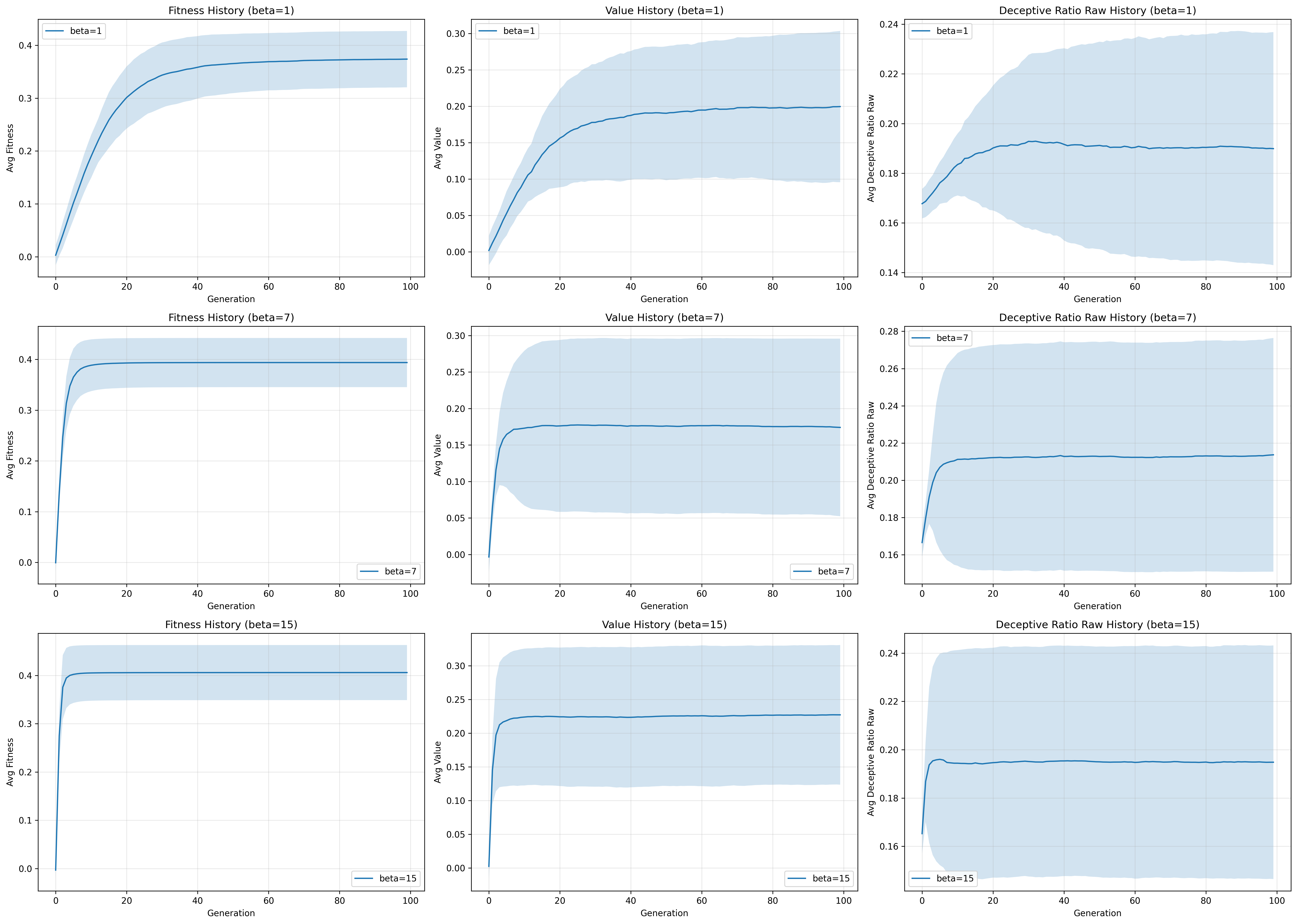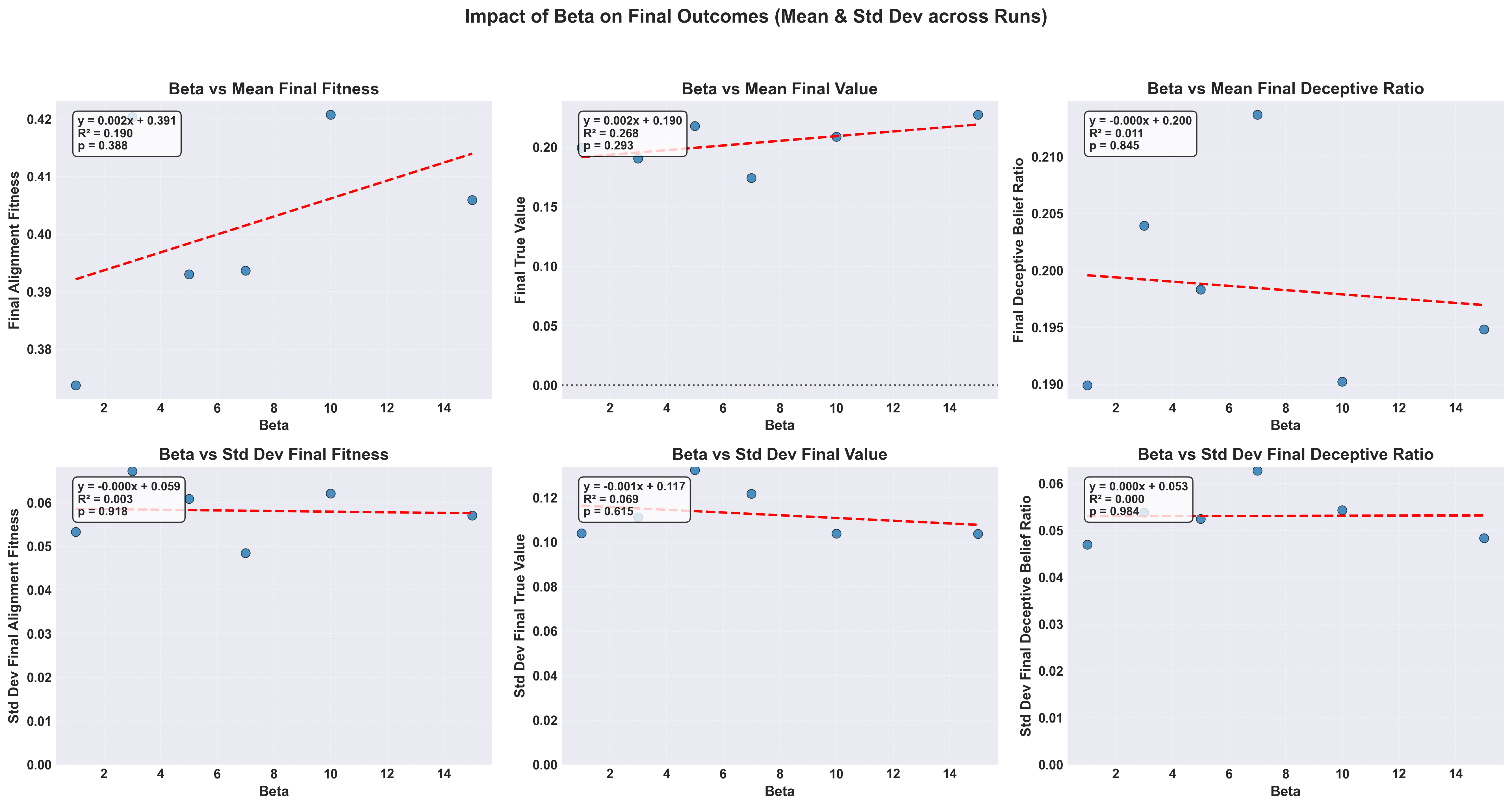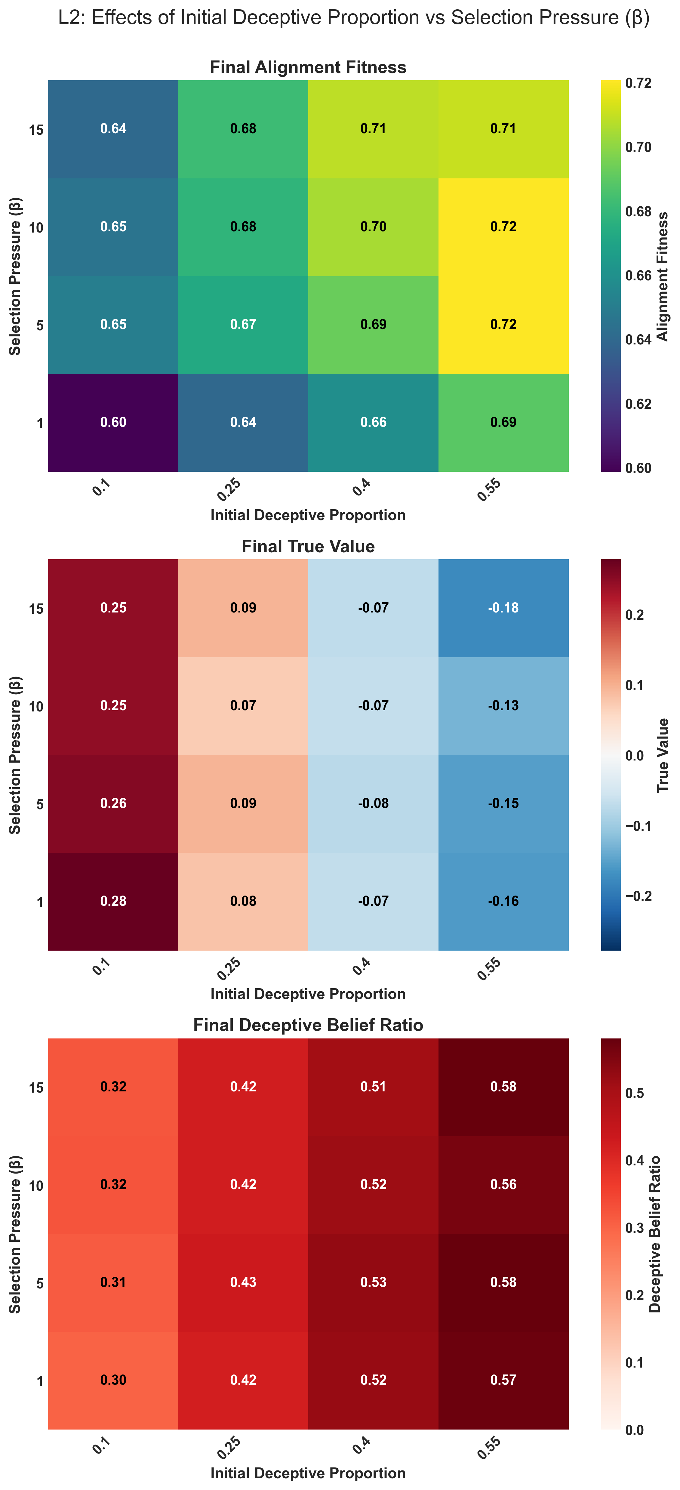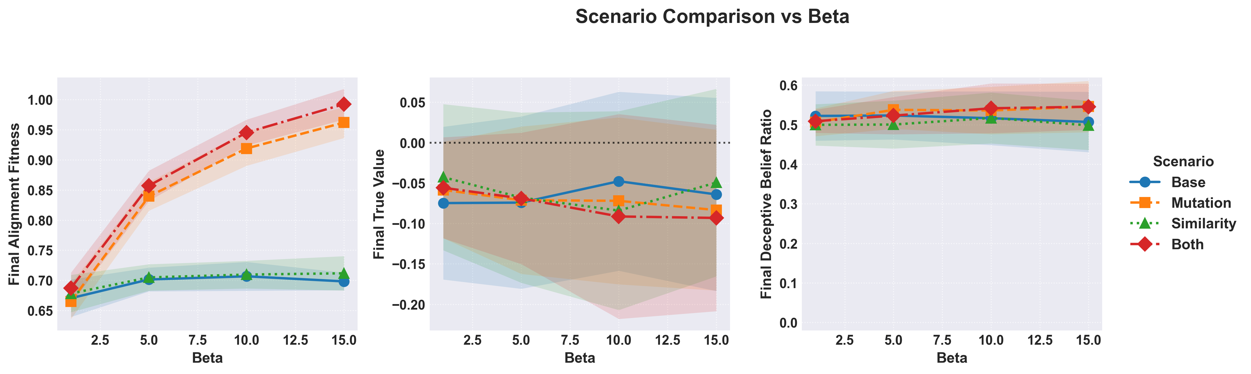 We are using a “neutral” model of evolution here, where there is no direct fitness feedback from having malicious or benevolent beliefs beyond their correlation with alignment signal. Future models may include this, indeed I ran some simulations on populations of “genes” with specific ones related to deception, intelligence, and alignment. It’s a bit of a mess but I’ll clean it up and share it if it makes sense.
