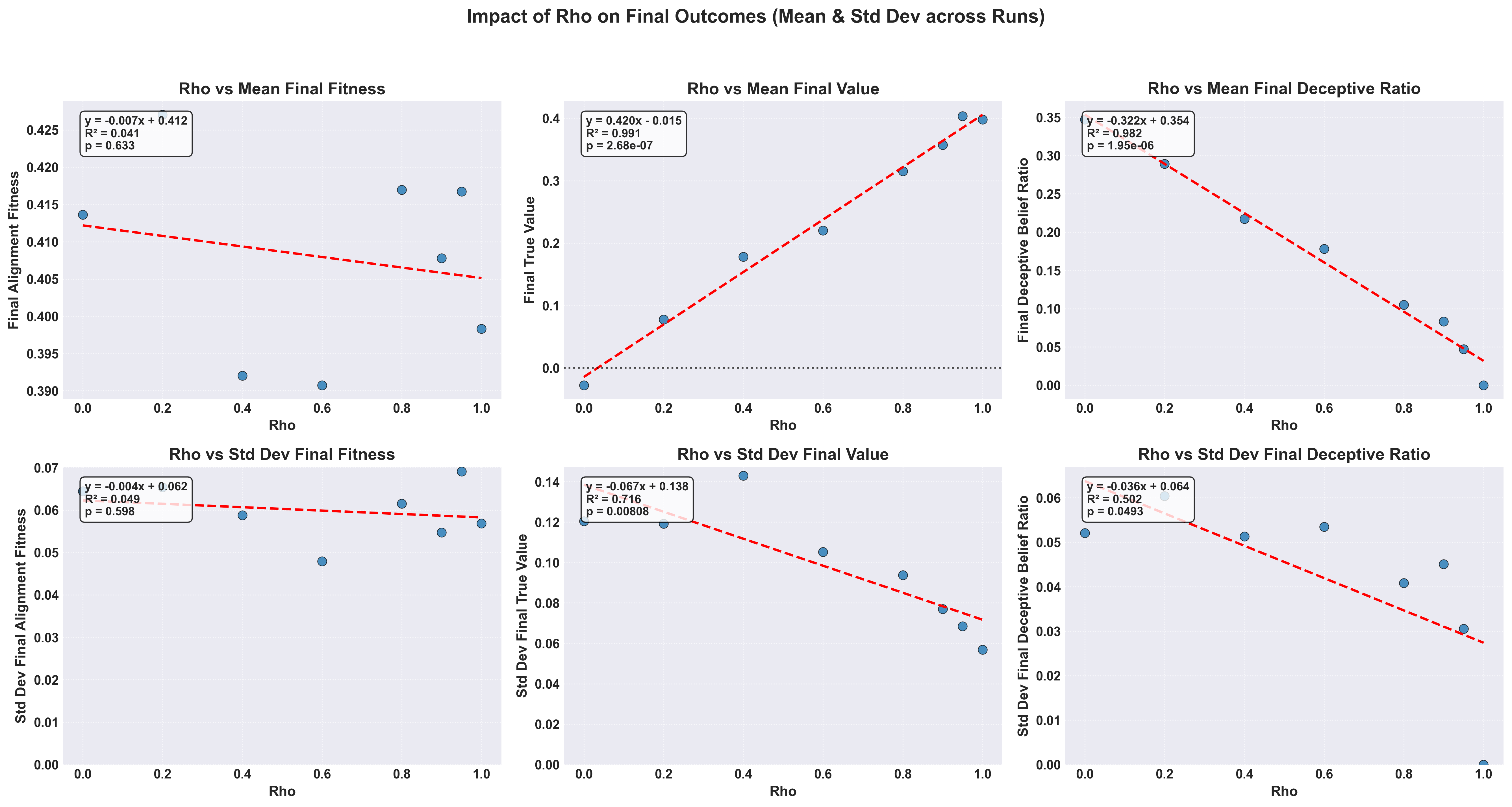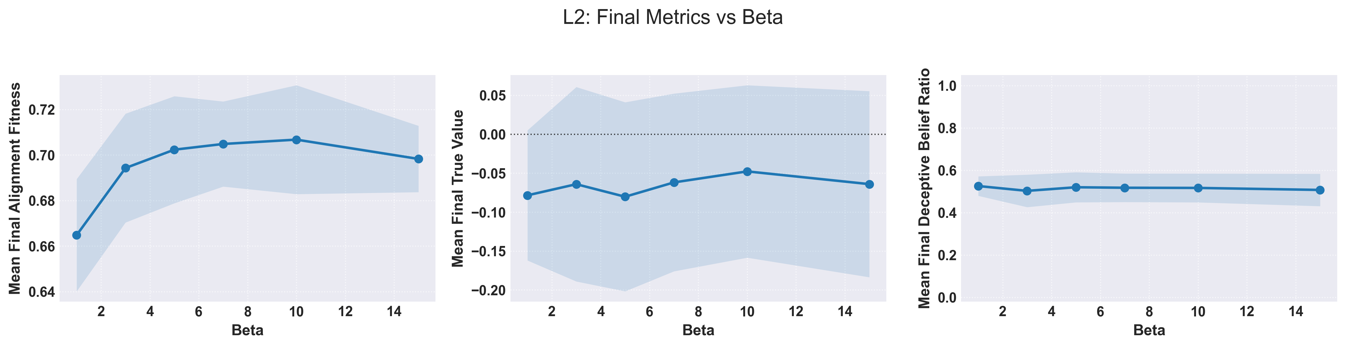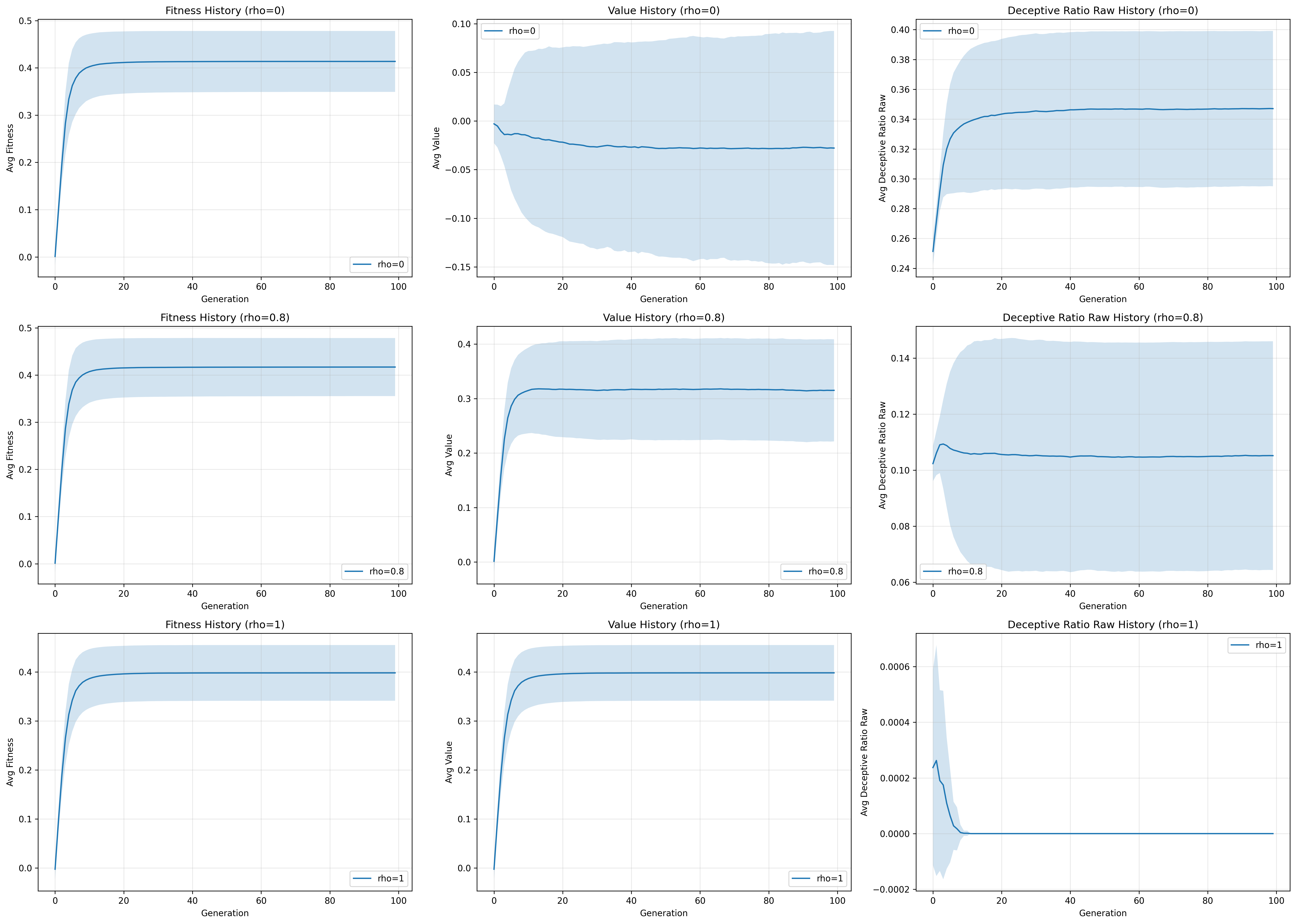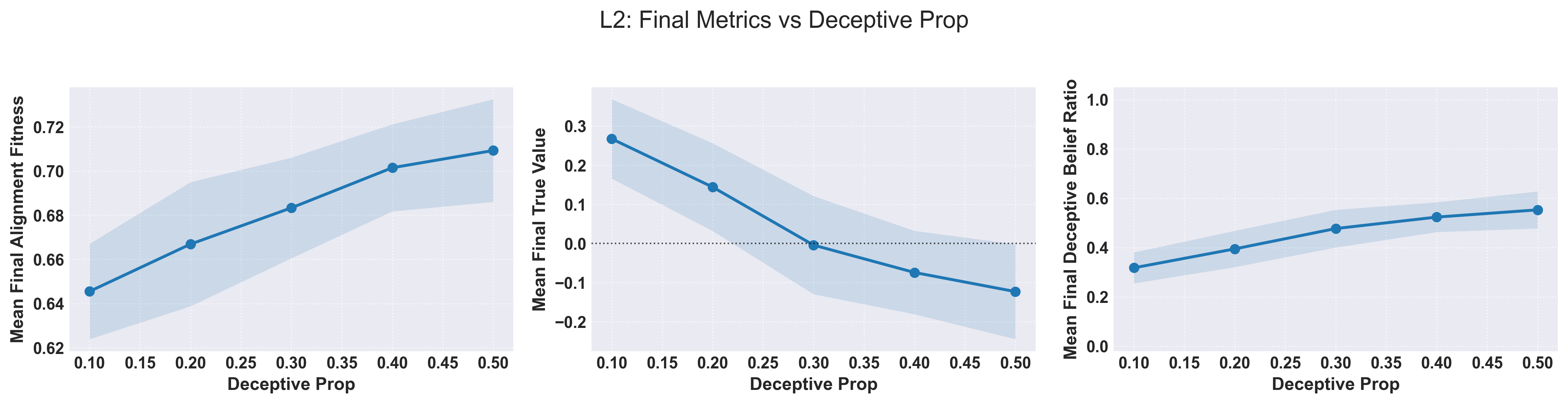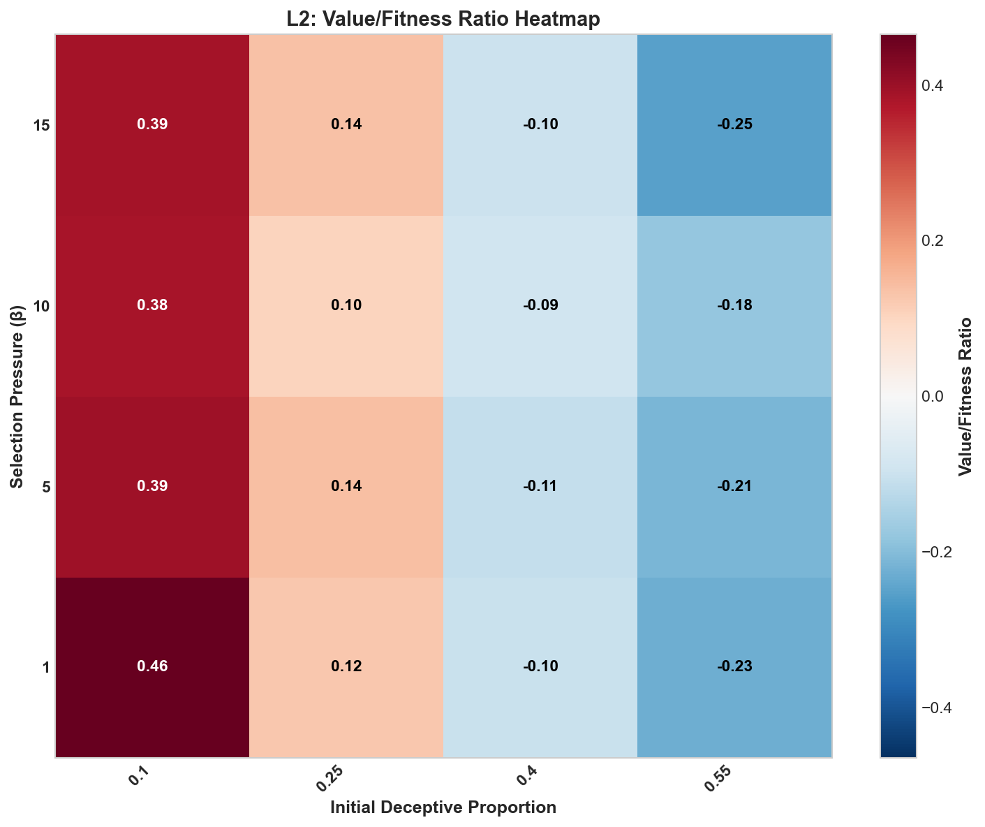 We are using a “neutral” model of evolution here, where there is no direct fitness feedback from having malicious or benevolent beliefs beyond their correlation with alignment signal. Future models may include this, indeed I ran some simulations on populations of “genes” with specific ones related to deception, intelligence, and alignment. It’s a bit of a mess but I’ll clean it up and share it if it makes sense.