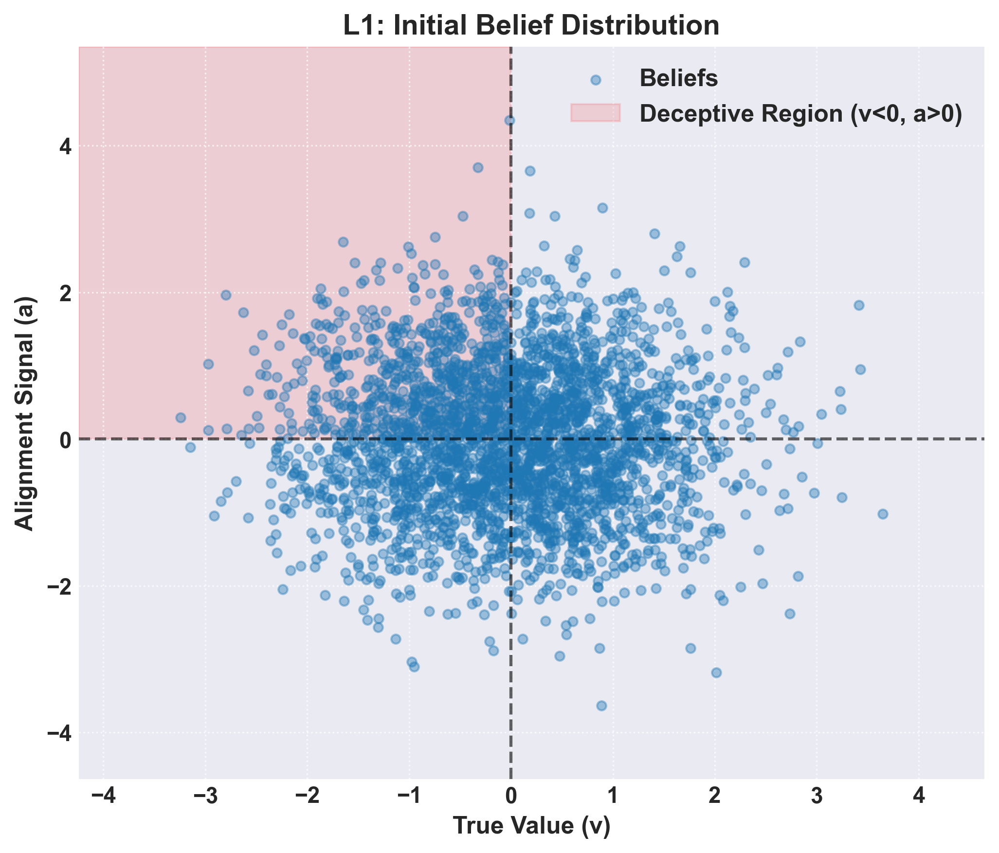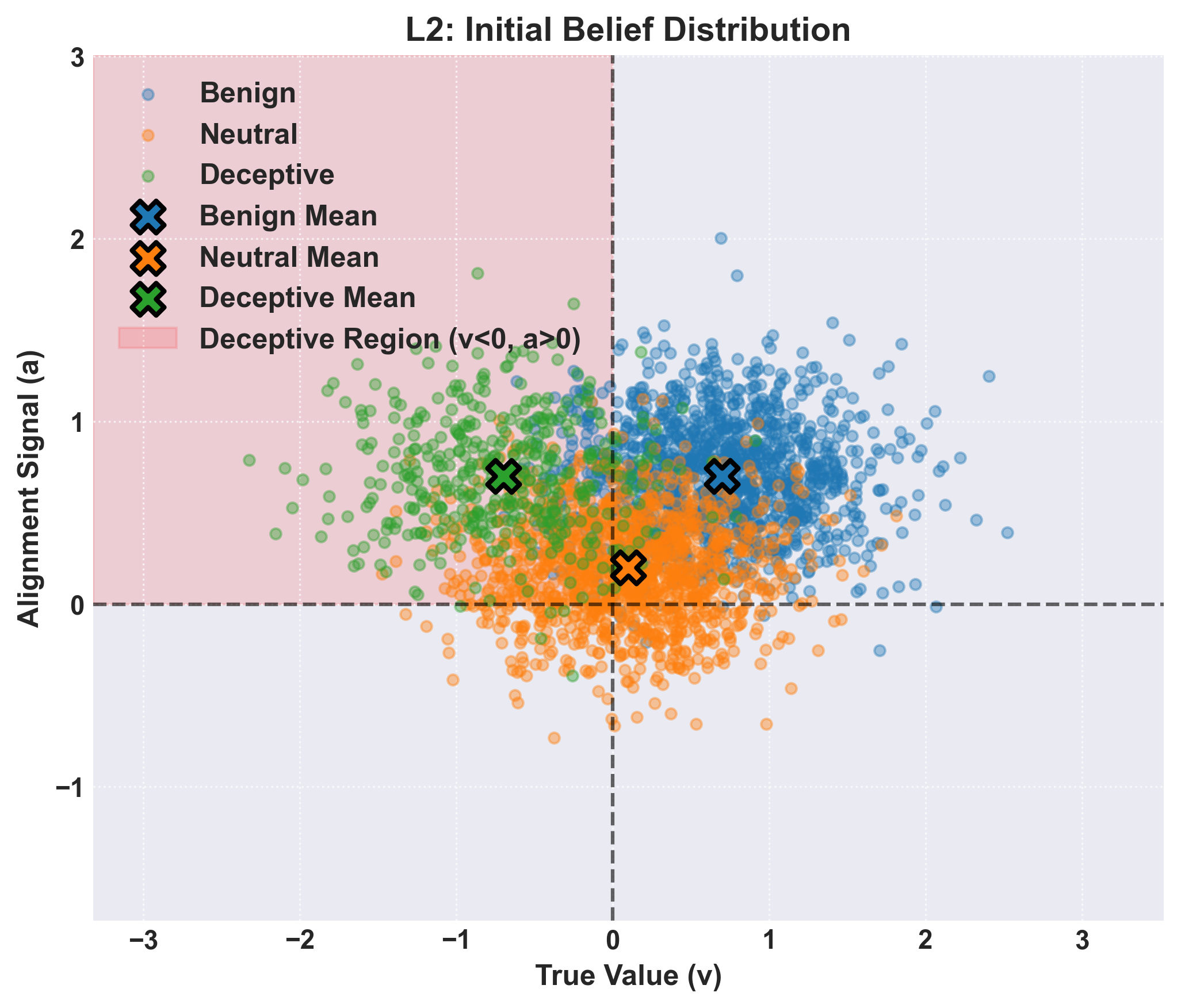 By varying we can control the correlation between value and alignment signals, which reflects both the natural overlap between malicious and misalinged beliefs, as well as the evaluator’s ability to detect alignment. Meanwhile by varying and we can model the spread of values and alignments available to the model.