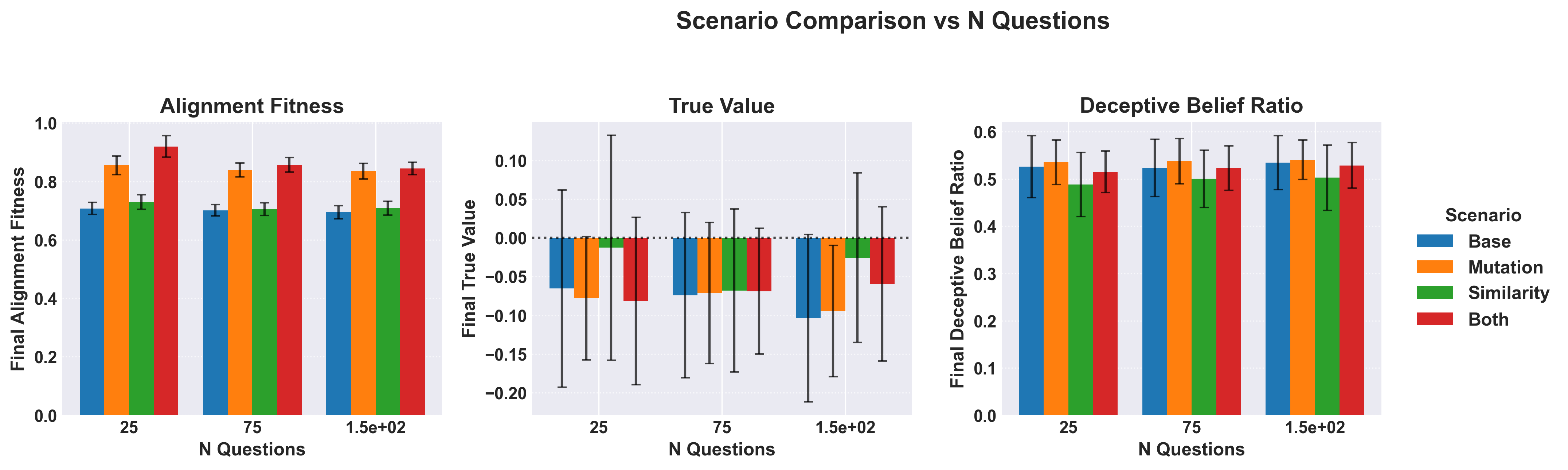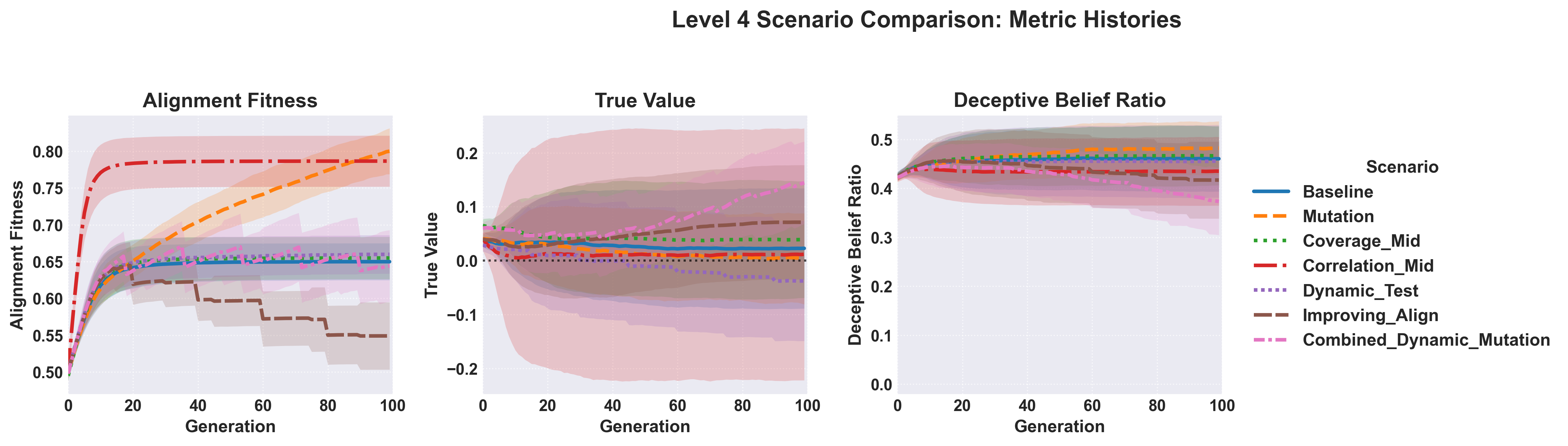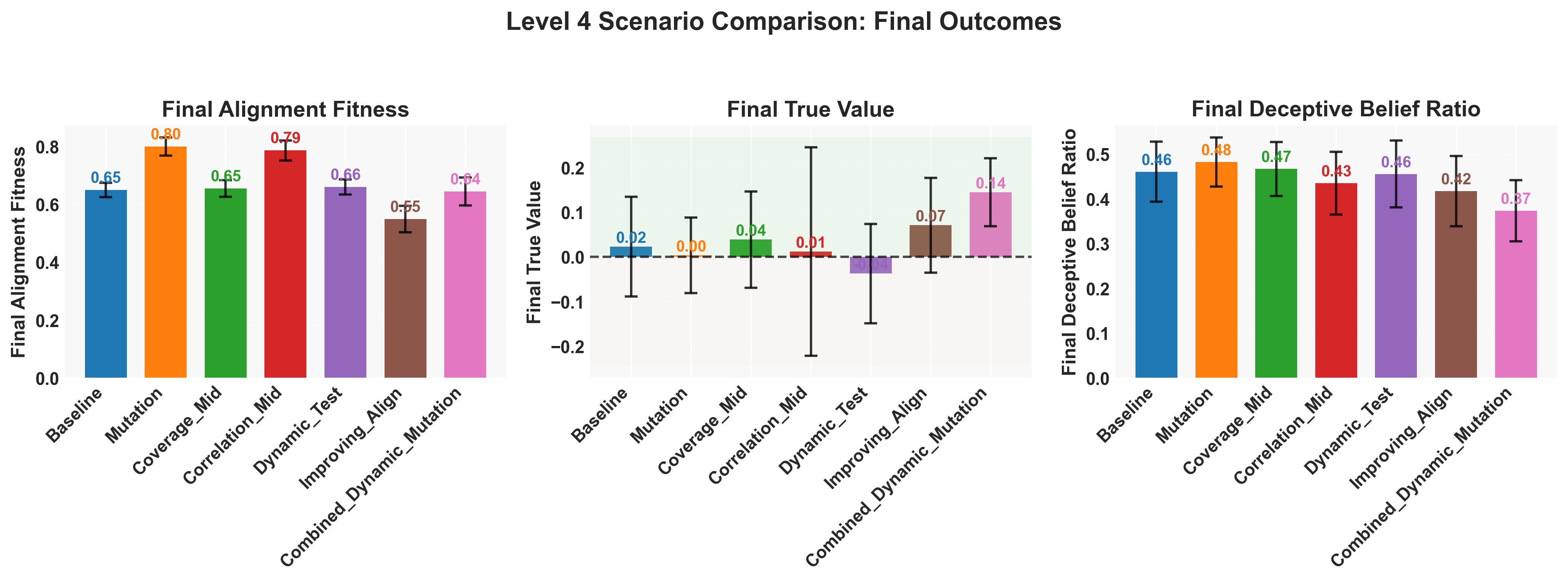 So In the next set a variety of cases were tested, such as how correlated the test questions are to one another, the coverage of tests on the belief space, and the responsiveness of test givers. The idea being that as the evaluators develop technologies for analysing LLMs the resultant ability to detect negative value beliefs increases. That said, it also attempts to model the bias of the test givers, with certain belief spaces being preferentially probed. The result was clear that iteratively increasing the alignment test ability, mutation of models, and the ability to dynamically test were required to drop the deceptive belief ratio and increase the average true value (Figure 12). While the most important contribution would be the improving alignment/value correlation, the inclusion of dynamic testing and mutations allowed for the alignment fitness to remain high throughout the process as well (Figure 13). Ensuring that we are not only selecting for positive value beliefs, but making new positive value beliefs appear more frequently.