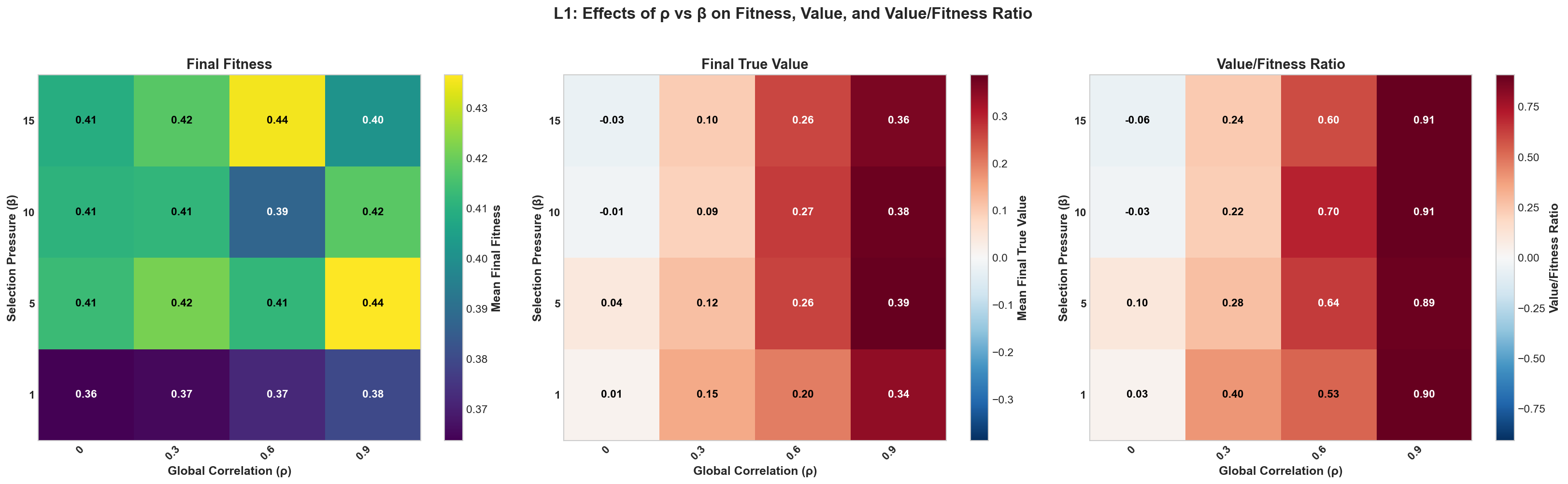 The most critical factors for analysing behaviour in these models are how correlated a beliefs alignment signal and value is (Figure 2). In the unimodal case this is designated as and shows the strongest correlation with final value score at a range of selection pressures (Figure 6). While selection pressure, representing how “important” an alignment signal is to reproduction, creates more complex structures (Figure 5). In the unimodal case there is little else that makes sense, while low selection pressure does result in a relatively lower fitness, there is no mutation to act upon so the bounding is more statically predicted by the initial conditions.